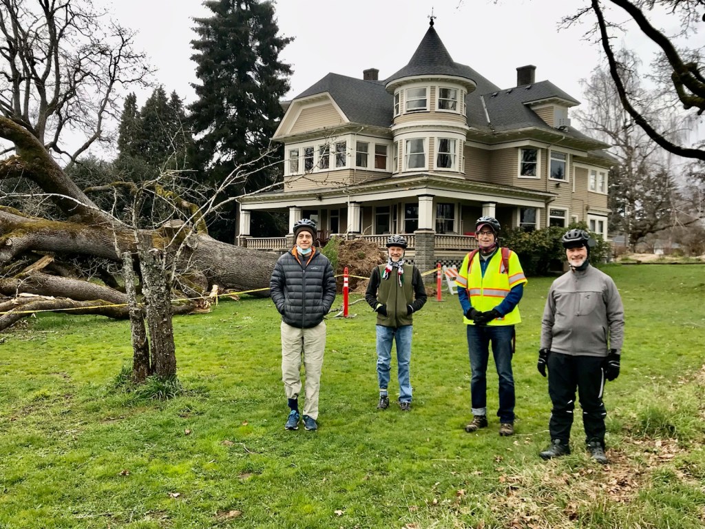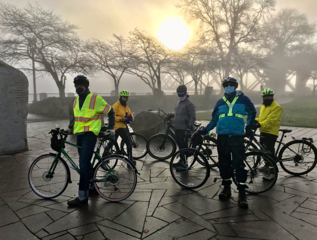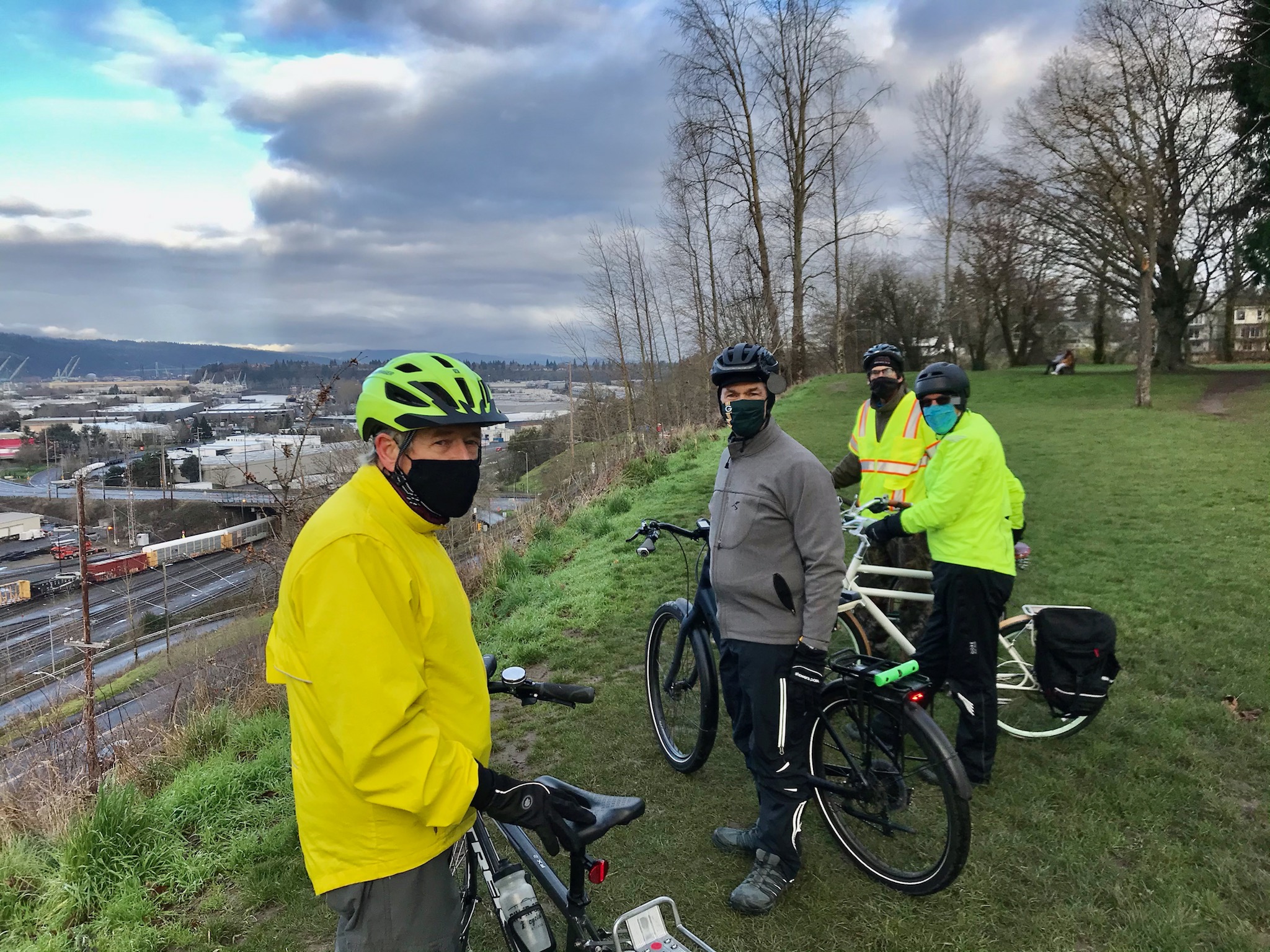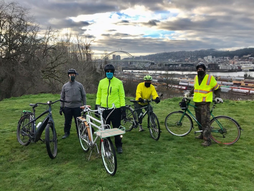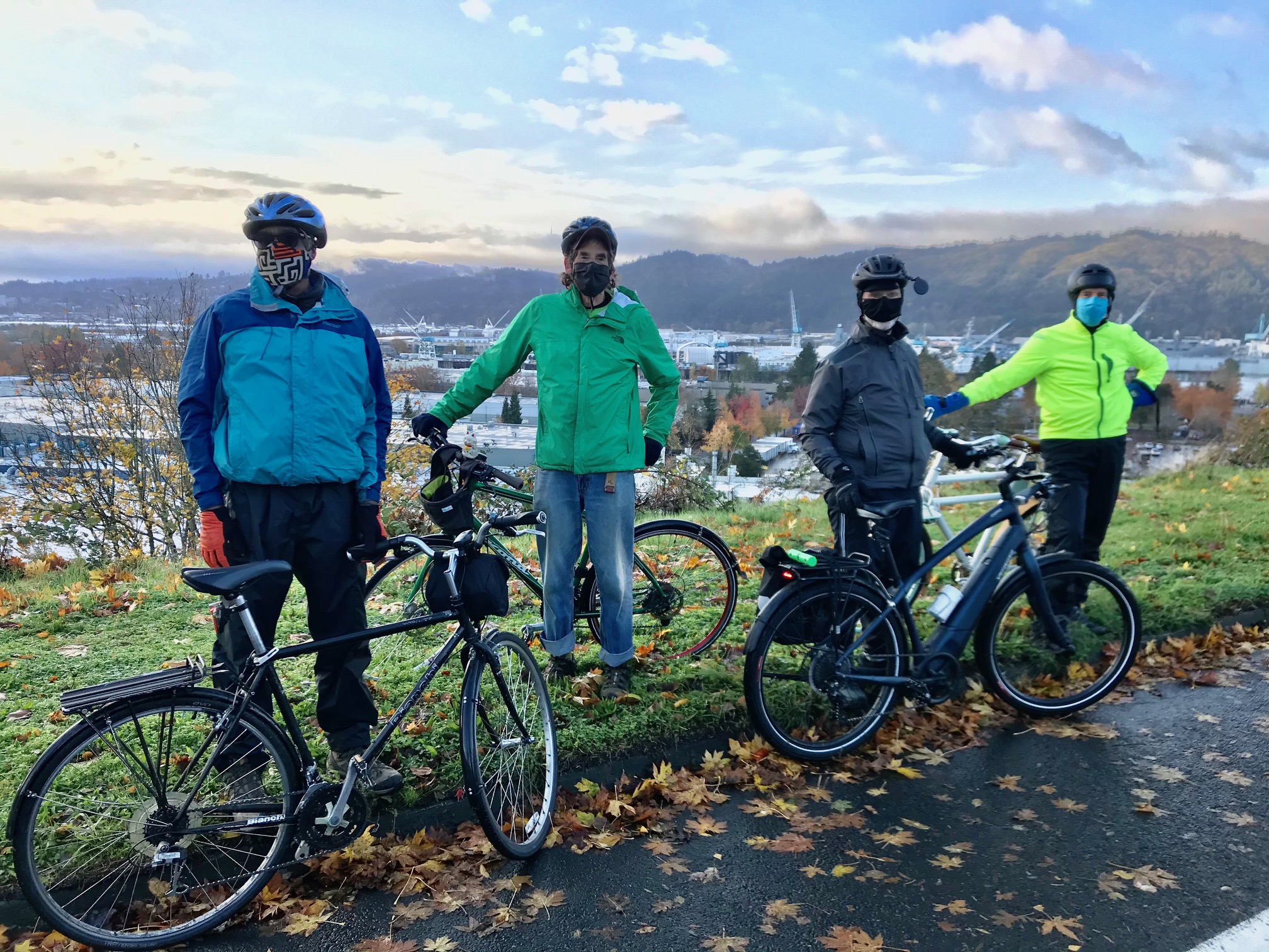MAY 31- On an overcast dry morning, five of us had a scintillating ride up Mt. Tabor to test our bikelegs, have an outlet for our George Floyd emotions, and catch a view of the City.