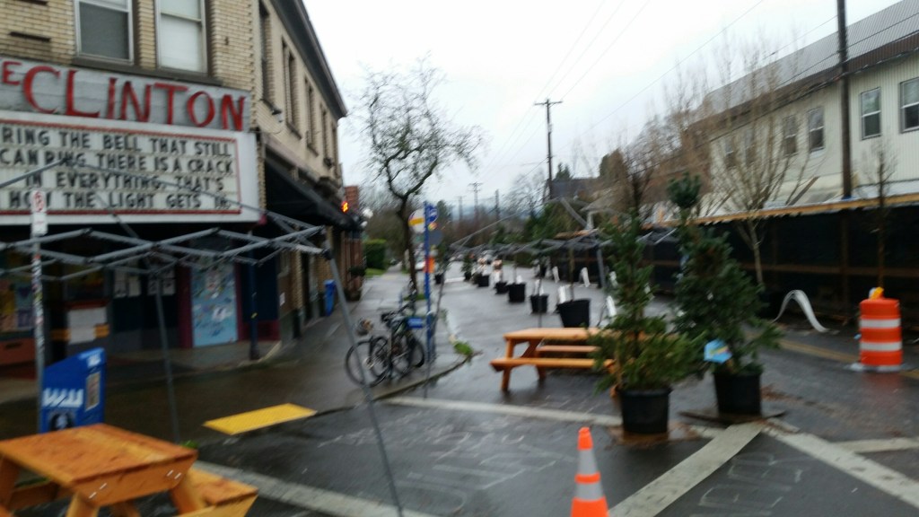 AUG 23– Today’s overcast outing took the five of us down SE Clinton – via the new eating area by Clinton St. Theater – to the improved SE 17th which we followed for 2 miles to McLaughlin Blvd., then U-Turned home.