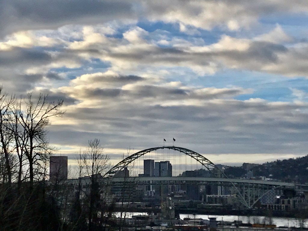 NOV. 29- Today’s 6 riders this chilly dry morning took a circuitous route to downtown via Going, Williams, Russell, Interstate, Broadway Bridge, Naito Parkway, Hawthorne Bridge, Eastside Esplanade, and back to NE. Thankfully after an overcast ride down there, the sun put on quite a show downtown.