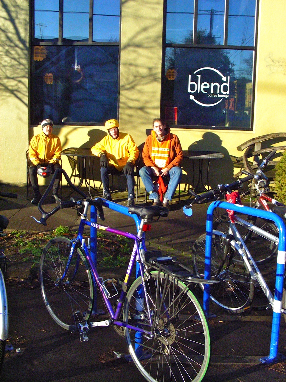 Five of us were on last Sunday’s outing, taking the scenic route via  Willamette Blvd. to reach Blend on N. Killingsworth just off Greeley.   Found a shop with two personalities, depending if you were in the section that used to be light-industrial-cinder-block, or the one that was commercial with lots of window space.   Also found ample bike parking.   Talked a good deal about the upcoming mayoral race.   2710 N. Killingsworth.    http://www.facebook.com/pages/Blend-Coffee-Lounge/40084213458