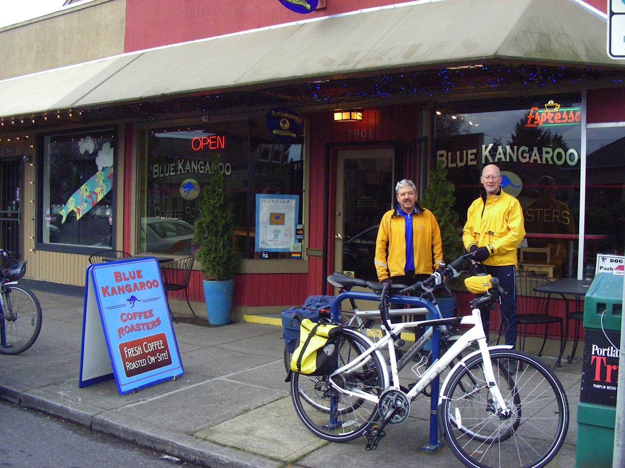 Three of our stalwarts, not to be denied when their original Sellwood destination was closed, opt for Blue Kangaroo, one of our favorites. It seems to we NE residents that the Kangaroo accurately captures the independent and homey feel of Sellwood. Today it was not only an exhilarating ride to Sellwood via the Esplanade, but the trip gave us an opportunity to check out the new bridge and return on the west side. 7901 SE 13th. http://bluekangaroocoffee.com/