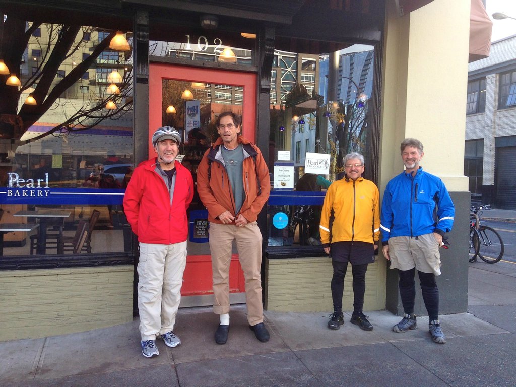 Though most of us had individually been to the Pearl Bakery before, we hadn’t visited as a bike group. Our impetus today was its recent ranking as the 10th best bakery in the country. Hang-out wise, its strengths are the full windows to the west and south, and the nice early morning buzz at other tables of friends obviously using the Bakery as a meeting spot. Its challenges are limited seating options, which coupled with an industrial feel, could deter long discussions. However, we do need to admit that they did not deter the five of us from energetic, often buoyant discussions on our growing lack of privacy, computer scams, the films Muscle Shoals and 20 Feet from Stardom, the chutzpah that is needed for most artists to be able to make a living from their craft, our cynicism over how bakeries can be ranked, how much of living to an older age we can control, and mushrooms, LSD and spirituality. 102 NW 9th http://www.pearlbakery.com