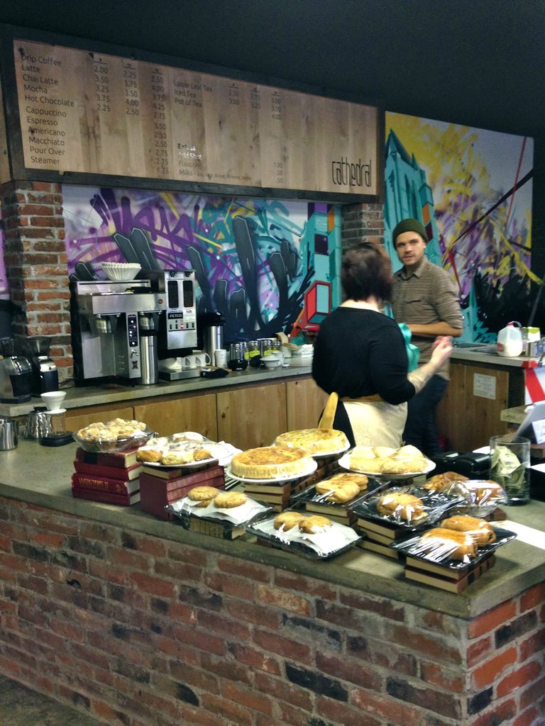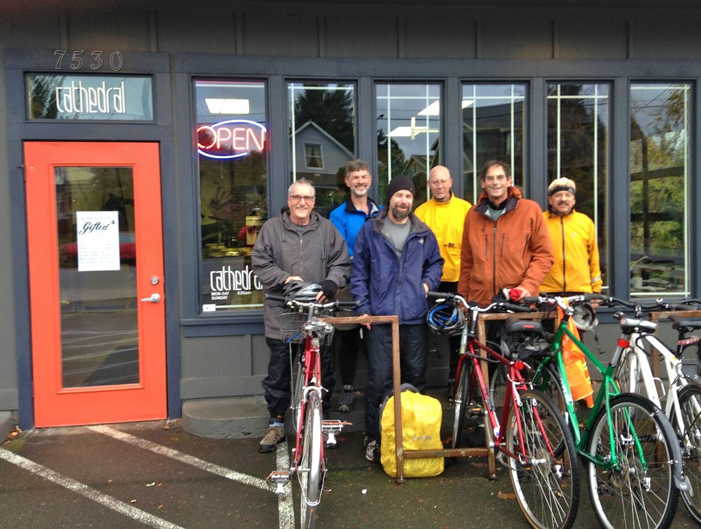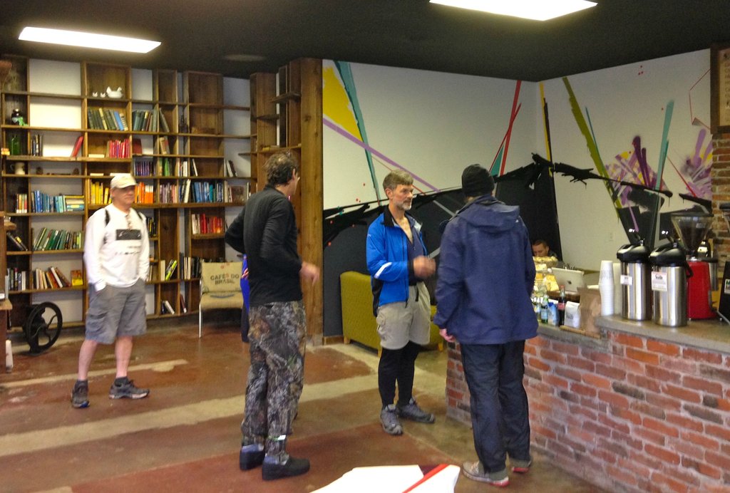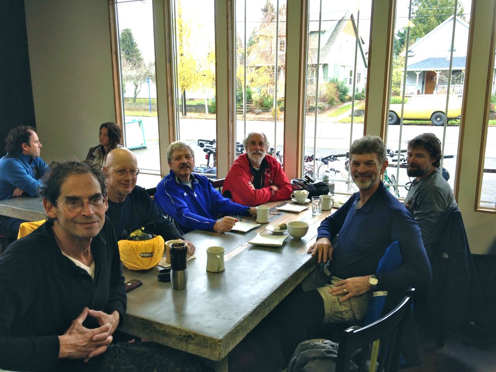 This three month-old shop took the seven of us by surprise. With great lights and windows, the latter possibly reclaimed, a definitely reclaimed barn door, bright yellow stool seats made out of wood stumps, brightly colored striped murals, a lending library, and a playful ambiance throughout, we felt we were in the midst of a great hangout discovery. We wondered how they ever inlaid the wooden strips into their concrete tables, and then covered such diverse topics as the amazing formula for Roman concrete being lost for several centuries, modern insulation materials vs. past ones, the governance situation of our friends new co-housing development and why some such communities thrive while others struggle, and the changing relationship of Teddy Roosevelt and William Howard Taft. 7530 N. Willamette