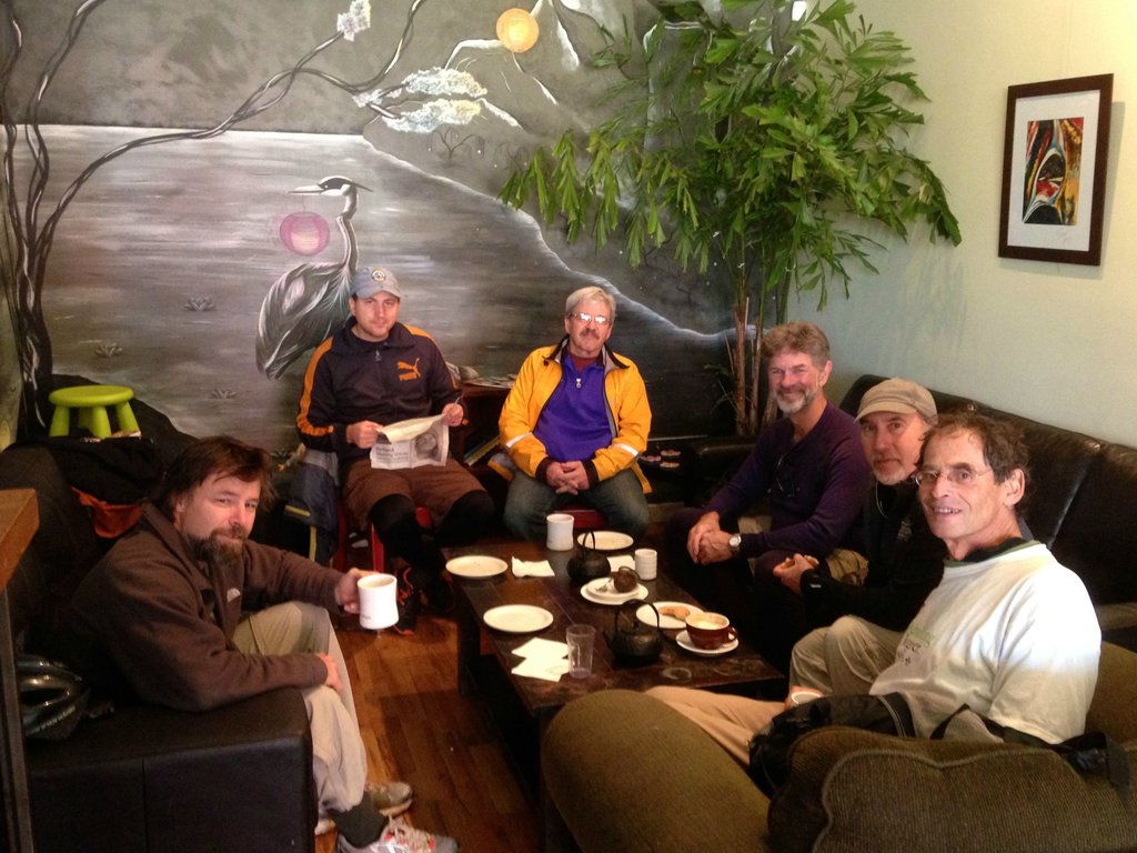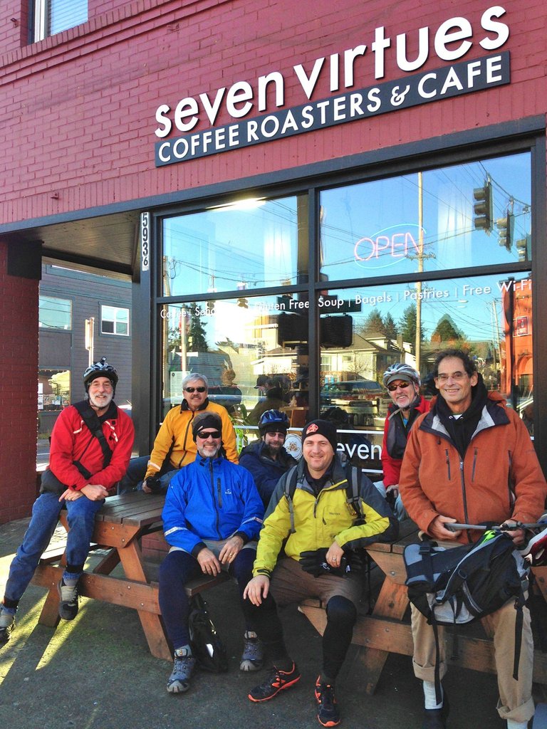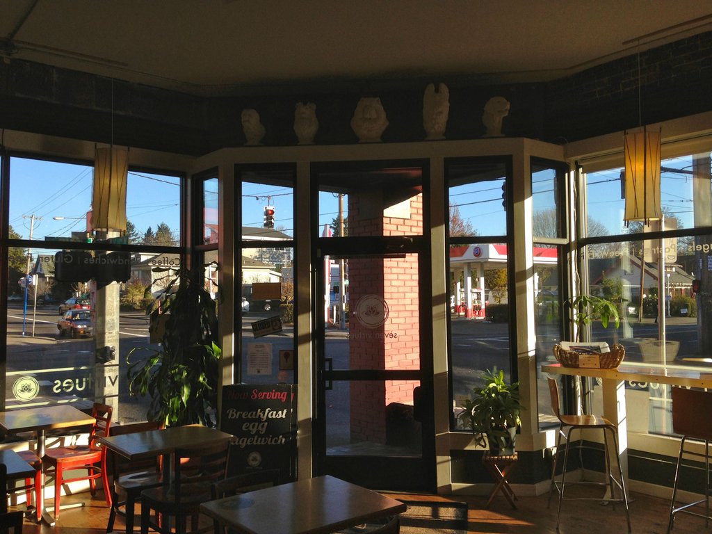 It’s been a couple of years since two of us last visited Seven Virtues, which was then recently remodelled. Today seven of us took the long, exhilarating way around Mt. Tabor to take advantage of clear skies and good company. Physically, not much changed with the shop. Though long and narrow, they’ve done a good job of taking advantage of the space and making it inviting and comfortable. There are two couches in the back for people to gather and talk around a table; this is also an area for kids. Otherwise it’s wooden tables and chairs, or stools along the window. The counter has clean lines and is quite efficient. Today’s topics included the origin of the term seven virtues (thankfully the smart phones corrected our wild guesses,) our upcoming New Years gathering with spouses, U of O’s fall to Arizona, and the psychology of being up or down for a competition. 5936 NE Glisan http:// SevenVirtuespdx.com