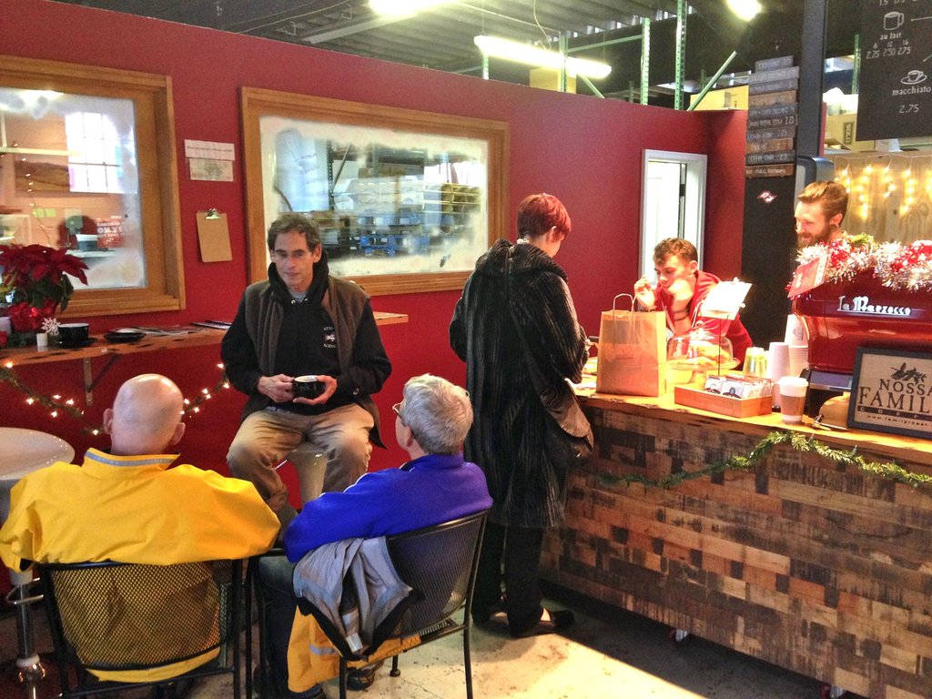 After last week’s successful trip to Barista Pearl, we returned to NW 13th and another quirky shop. When Nossa Familia says Bar, that’s what they mean rather than “shop.” This site is the company’s warehouse and roaster, and a small counter attached to the warehouse sells retail coffee and assorted gifts. Inside there are only 2 stools for sitting, so we brought in two of their outdoor chairs and huddled in a corner. Nevertheless, we had a good time learning about the genesis of this Portland outlet for the Brazilian owners of Familia and their coffee plantation, and talking with the super-friendly customers who seemed like regulars, bantering with the two baristas on duty. Finally of note, the bar is across the street from the Pacific College of NW Art’s other worldly bike shelter. 811 NE 13th http://www.familyroast.com