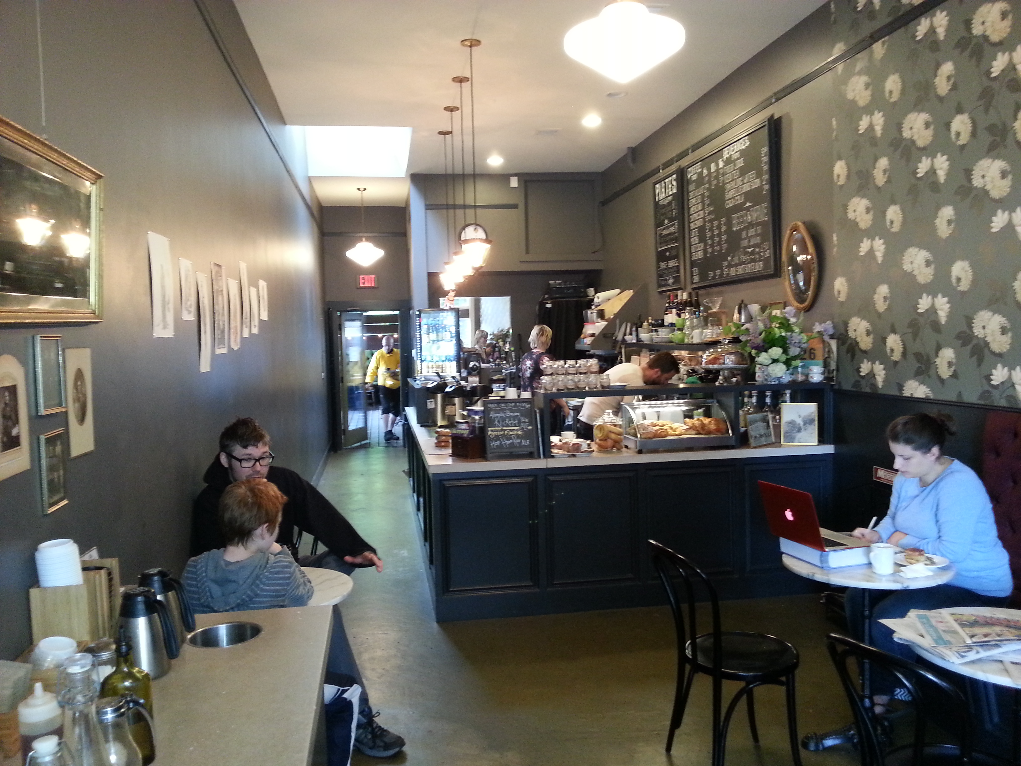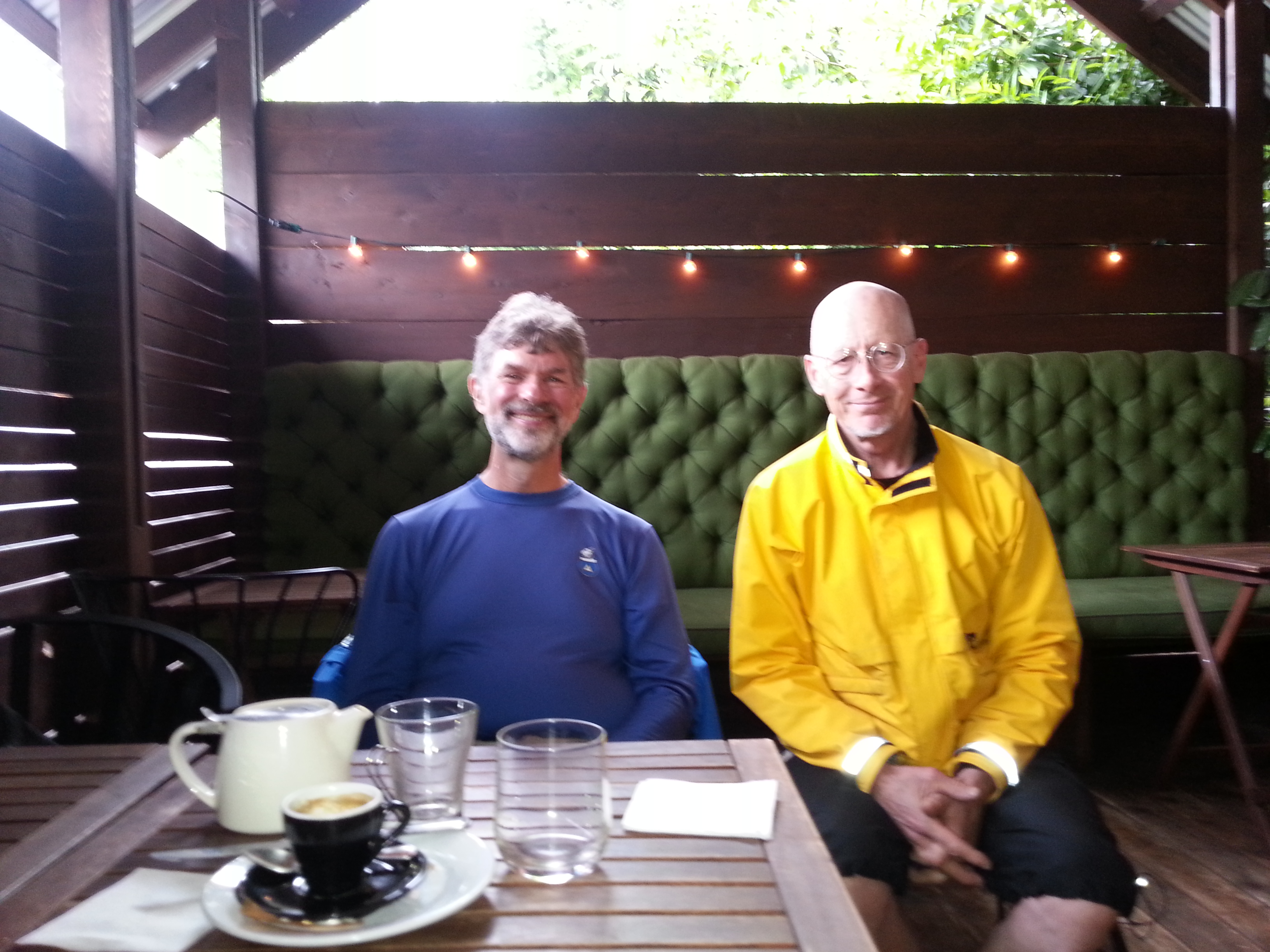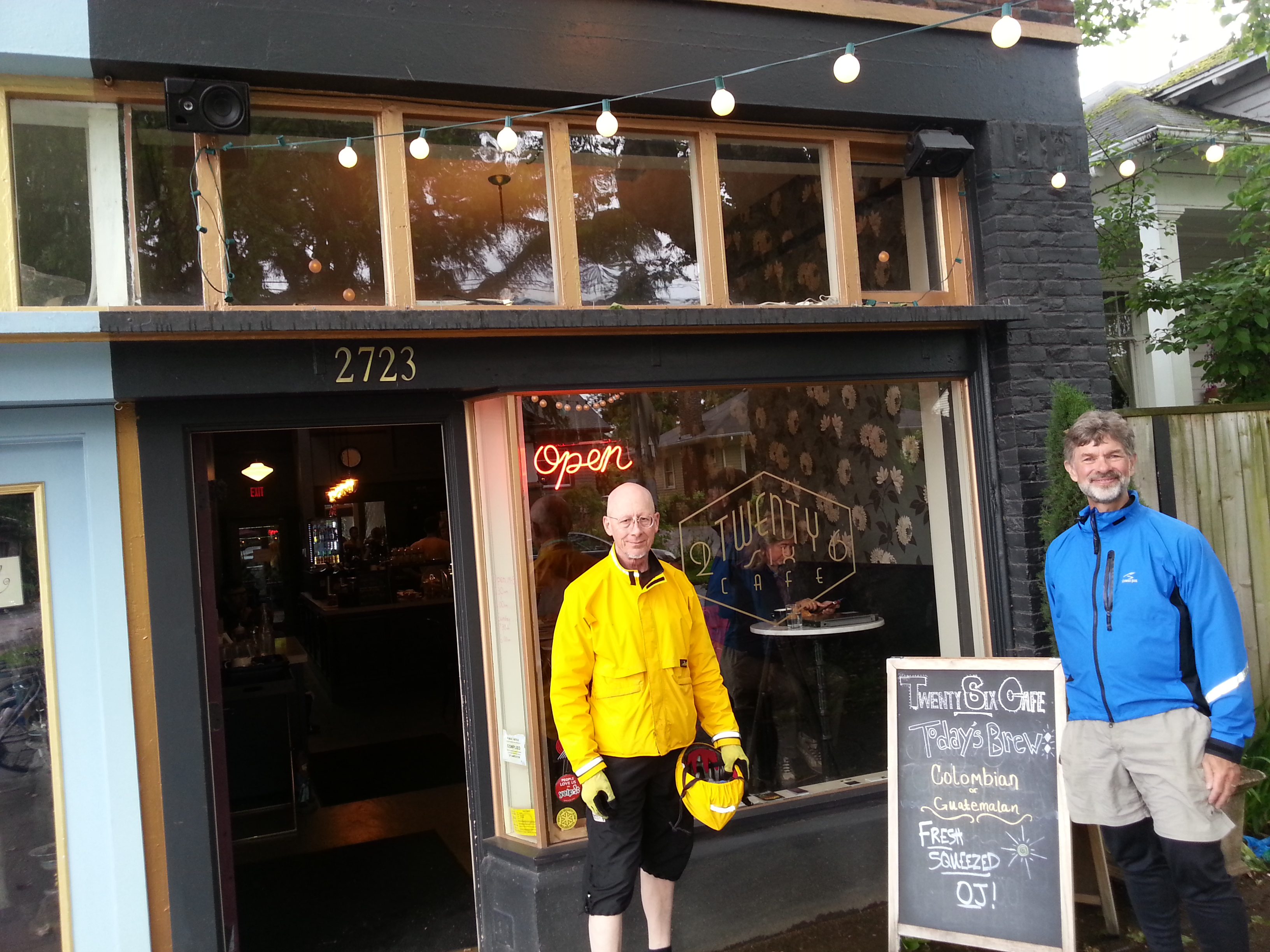 Although we had been planning for a ride to a new SW shop, the three of us changed to this close-by NE destination in part due to a marathon closing certain bridges and roads, and in part due to more rain than we were ready for. With this cafe’s pleasant atmosphere, and our engaging light-hearted conversation, we had no regrets.