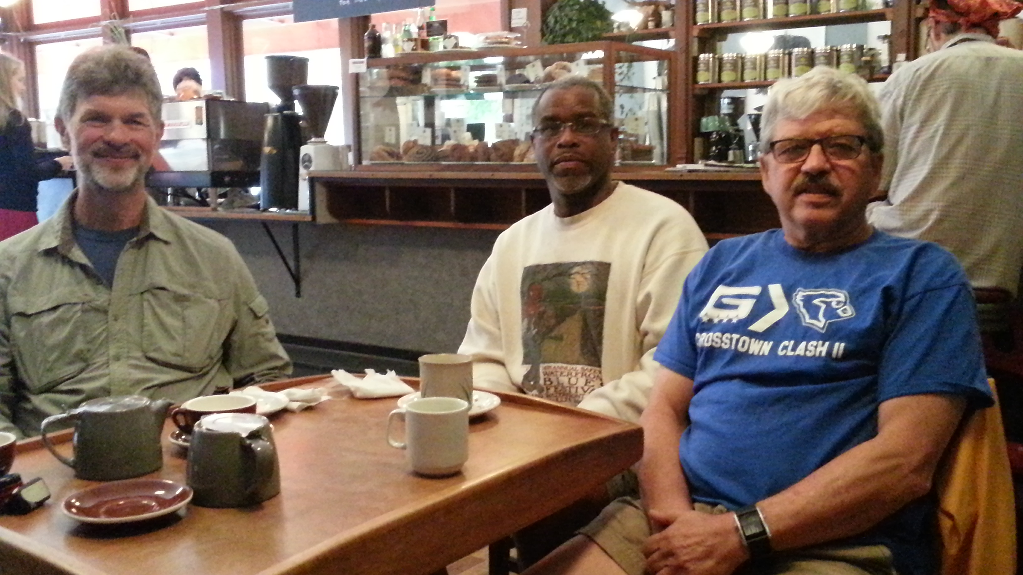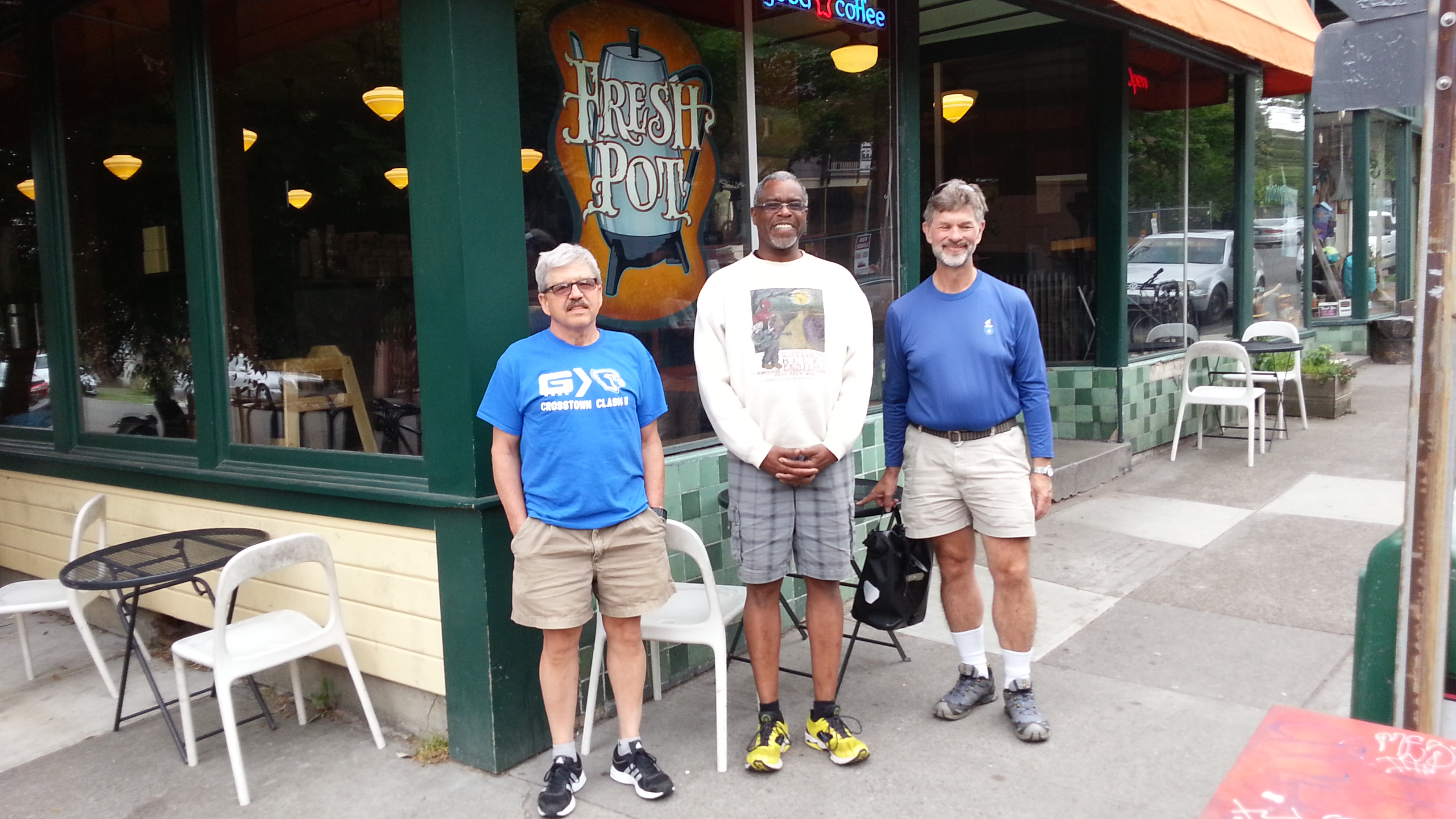 Our group of four suffered some snafus this morning on our way to visit Stash Tea on Mississippi. First, T, whose birthday it was, had lent his bike out to his son, not expecting son M wouldn’t come home Sat. night with the bike; ever resourceful, T oiled up daughter Y’s bike instead. And then H, led folk to Mississippi believing that the Stash Tea store actually opened at 8; maybe it did months back, but now it wasn’t opening until 1o; thus, the resourceful four revisited one of N. Portland’s coffee shop pioneers, The Fresh Pot.