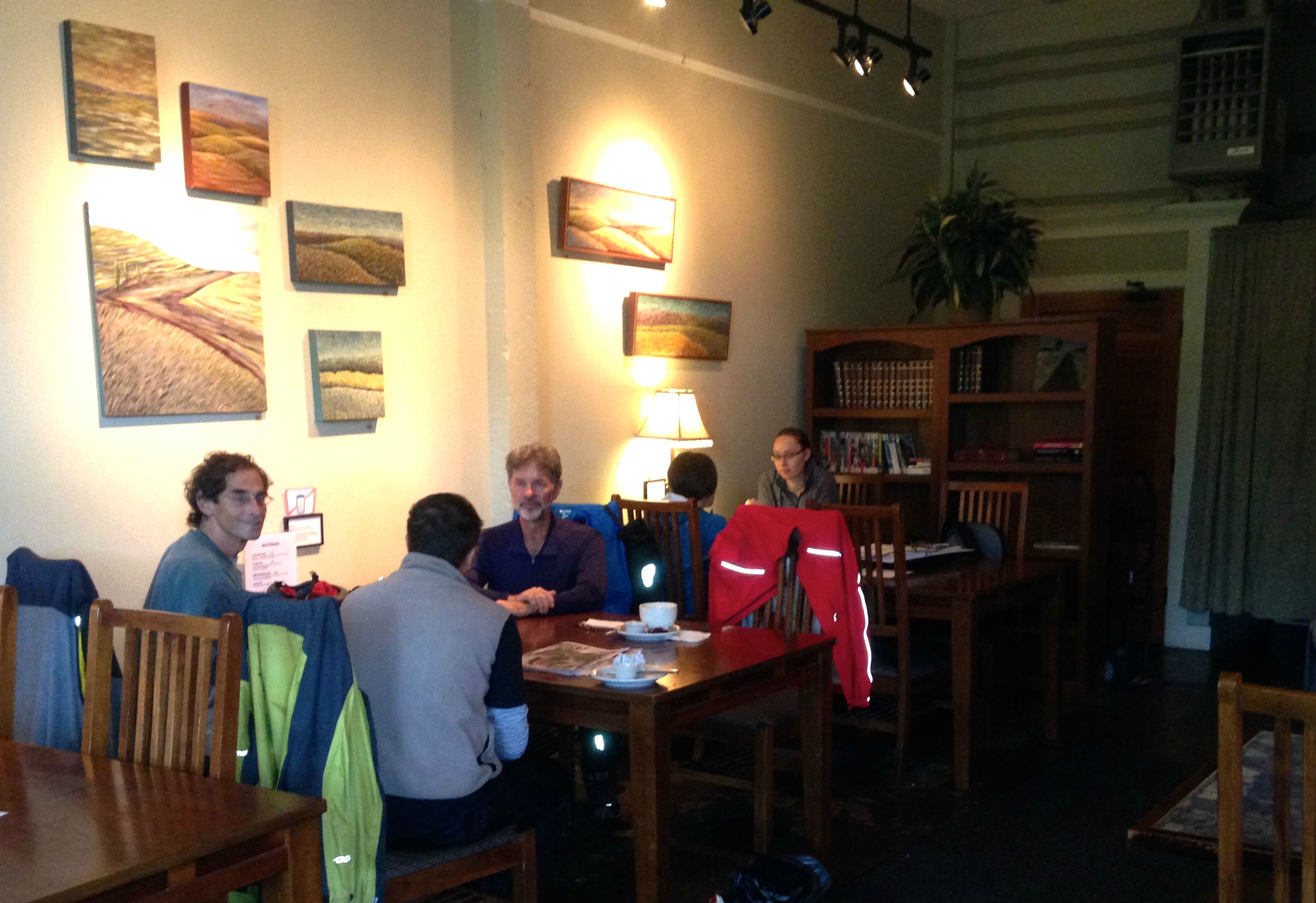 We were in the more formal rectangular room with its hard chairs, but this didn’t stop us from having a long, spirited discussion on climate change. We – all believers that the earth is on a dangerous precipice – are challenged by an inability persuade the populace that radical changes are needed in our economic system, and personal life styles, in order to stave off global catastrophes. We talked a lot about possible strategies, but A served as a devil’s advocate more than once in pointing out each’s flaws.