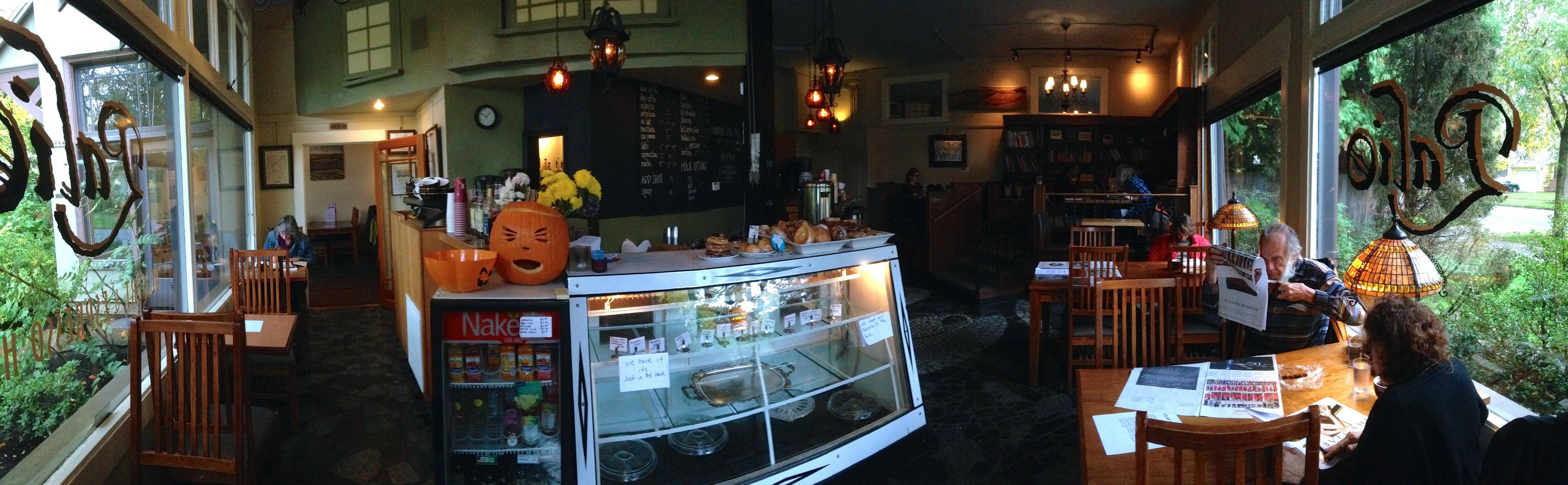One of Palio’s two rooms is rectangular with the feel of a formal library due to its heavy wooden chairs and tables, stained glass table lamps, and books. There are actually more books, and magazines/newspapers, on a raised section of the angulated room one uses to enter the shop, and order from the front counter. This entry room feels less formal, possibly because of the room’s angles, raised area, and the soft couch with reading table that was covered with today’s newspaper.