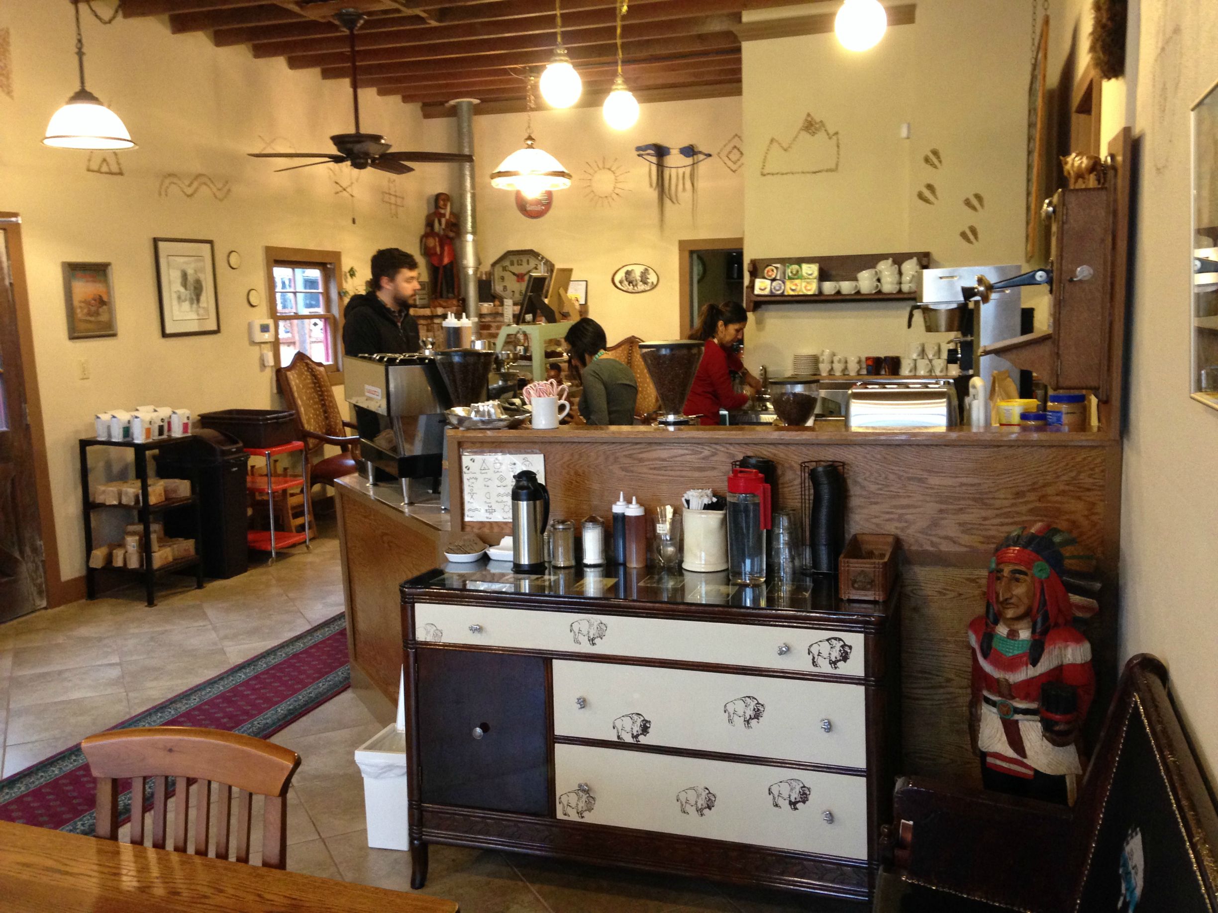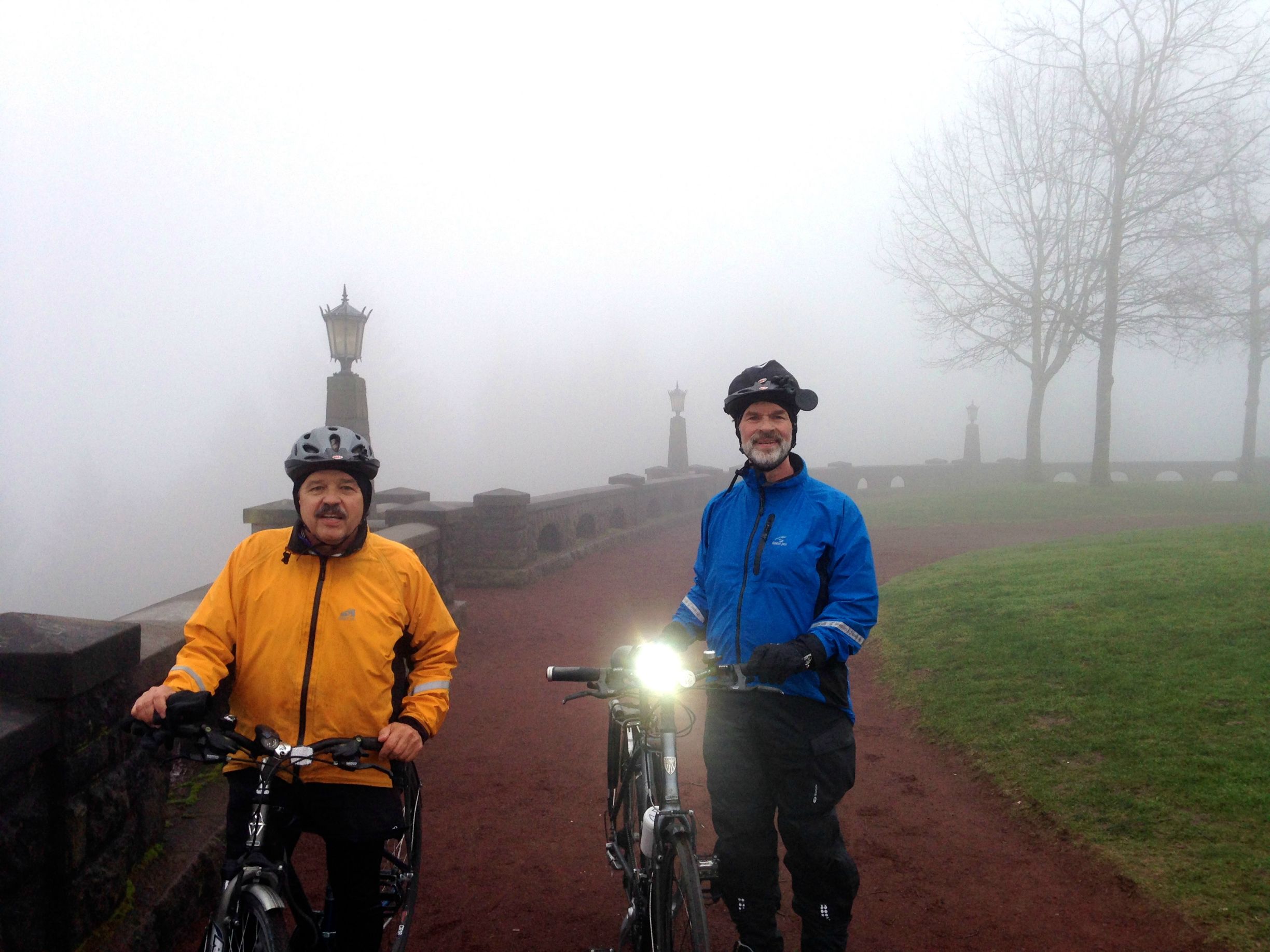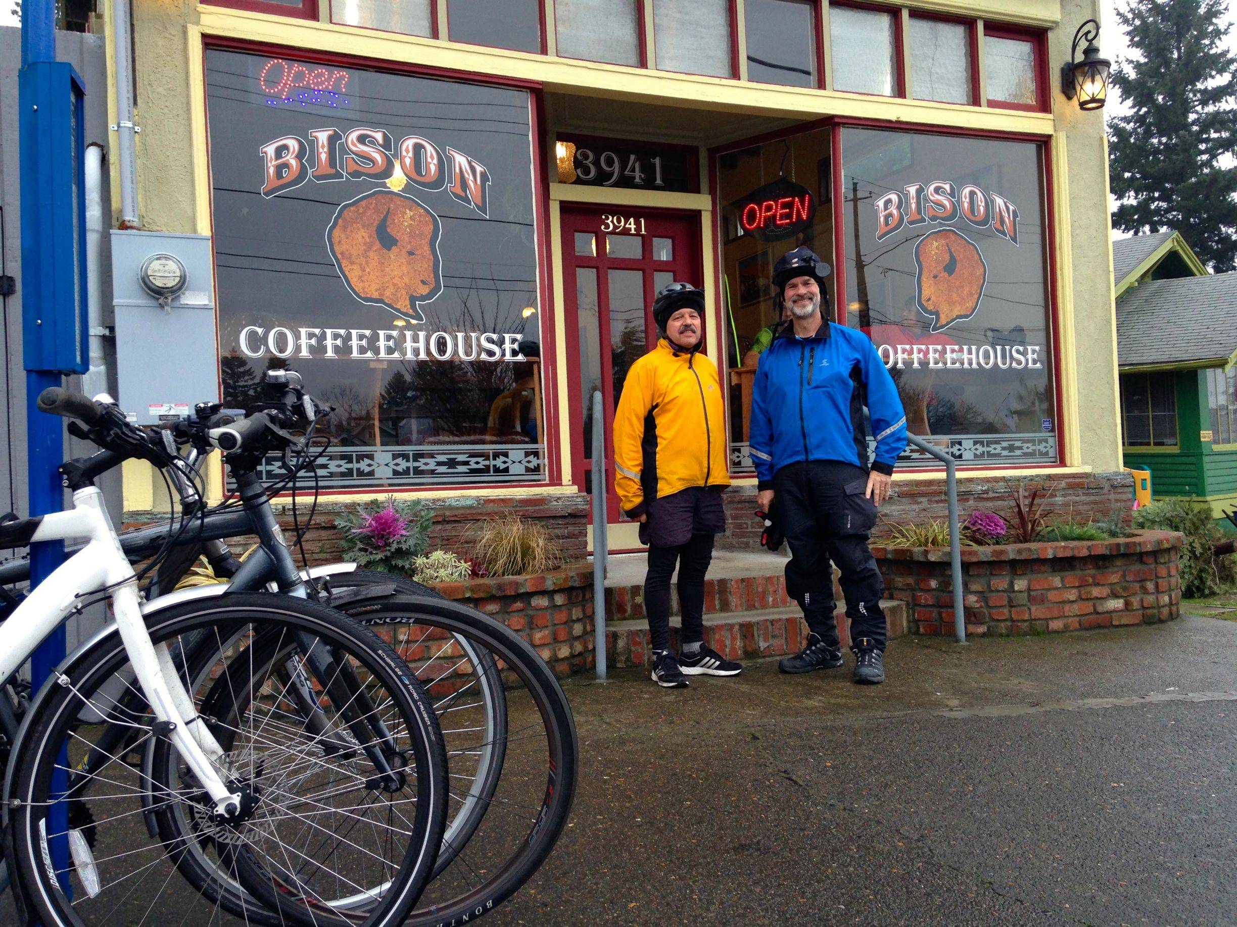 Three members rode up Rocky Butte this foggy morning, with Cully’s Bison Coffee House as their destination. Even with the lack of bike parking, we were mightily impressed by the warmth this cozy shop exuded, helped by an interesting array of Native American art and memorabilia, and some antique furnishings.