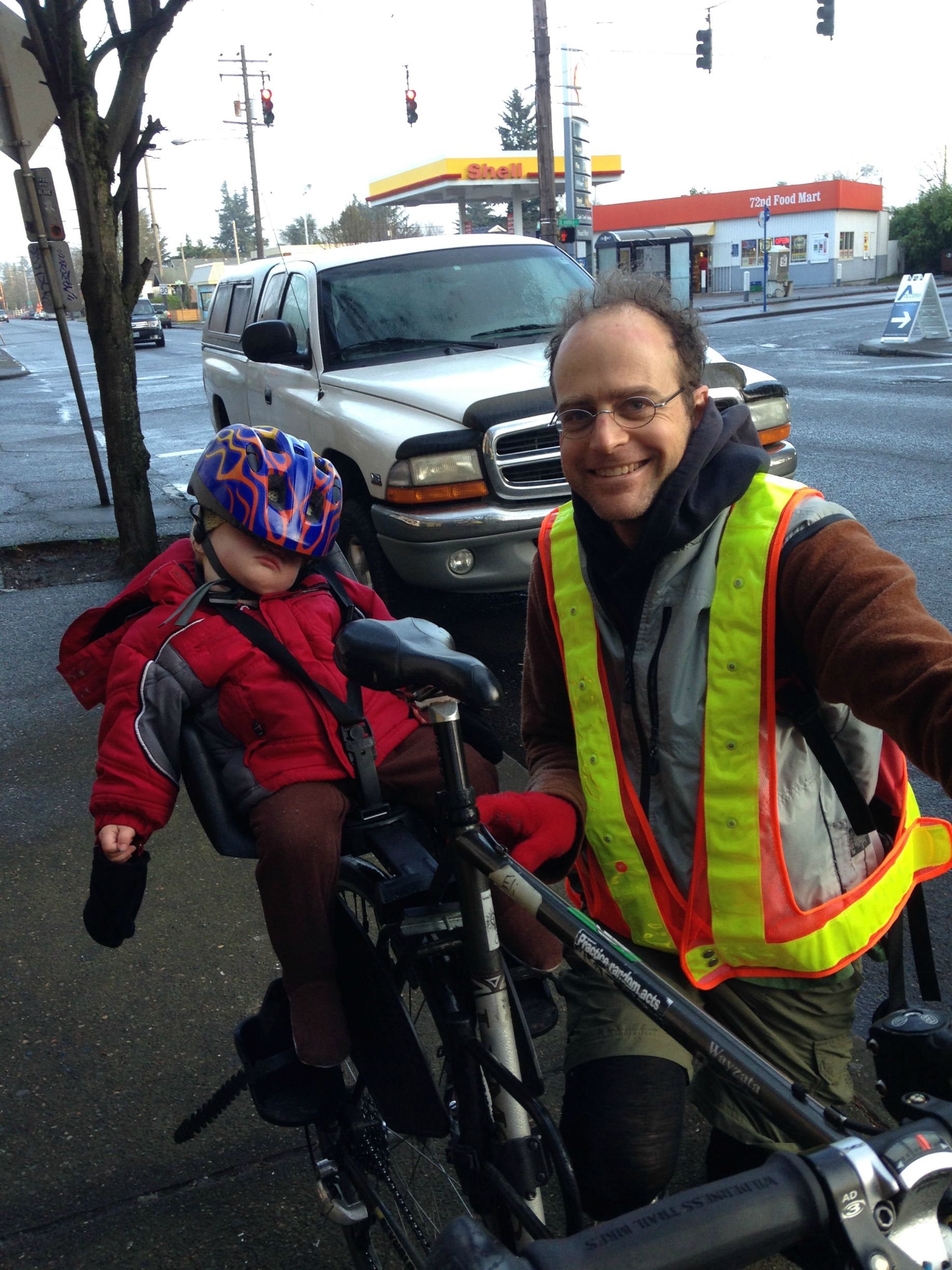 Five and a half, (Sidney’s 2+ yrs. old), of us rode cross town this morning – to the Mt. Scott Community Center area – to learn about the Space Monkey. Unfortunately for the shop’s owners, their glassed front door had been broken in for a robbery the night before.