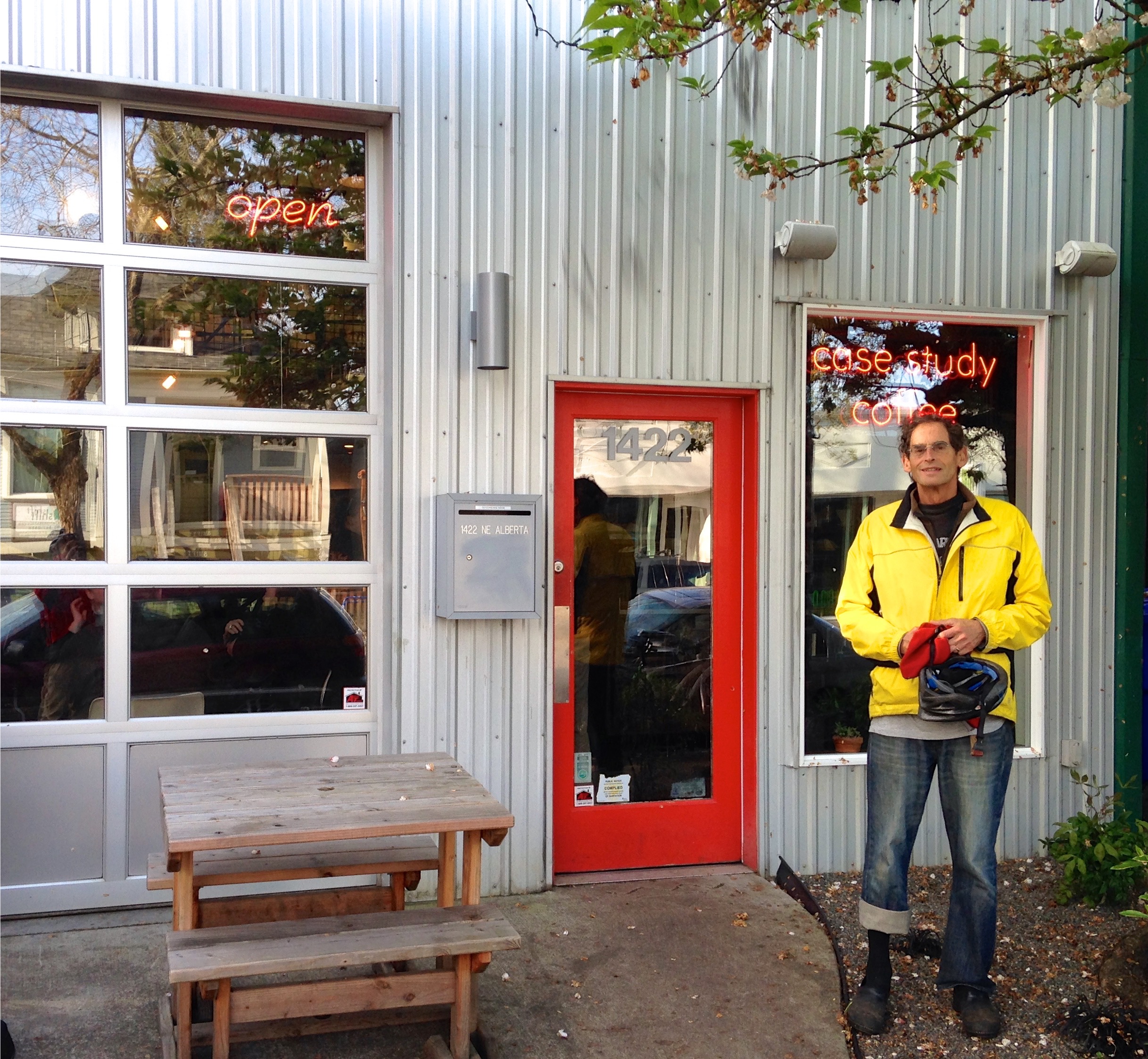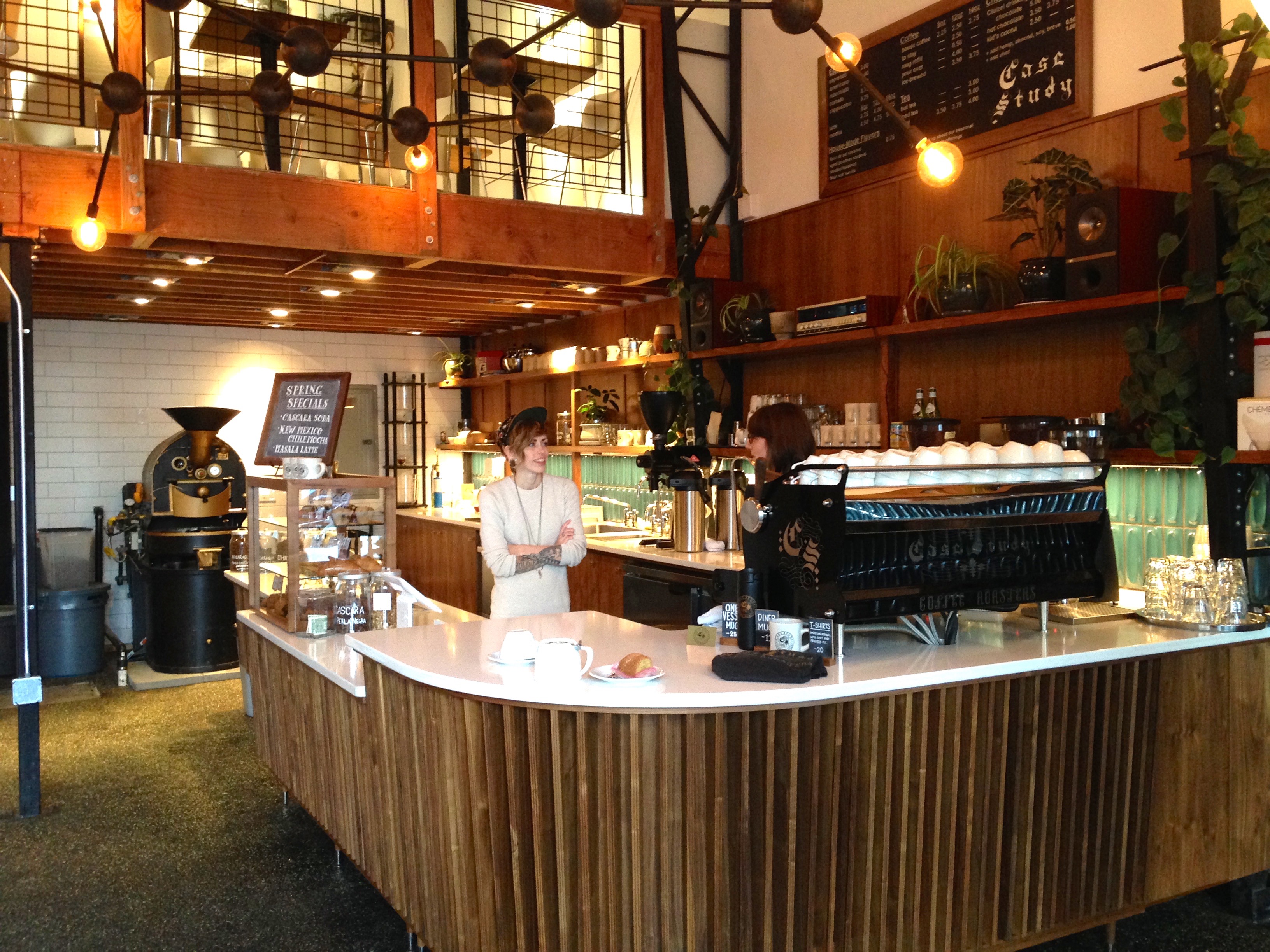 Two stalwarts on this chilly early Easter morning – who happen to have been raised Jewish – started out early to visit Case Studies’ relatively new shop on Alberta. And we’re glad to report that CS should be proud of how they’ve transformed a relatively small space with a loft – (with the exception of plastic chairs being squeezed very closely together) – into a cozy space that is very welcoming for hanging out. They have created another iconic sculpted lighting structure for this outlet, have great lighting plus a glassed garage door that opens in warm weather, built a craftsmanlike counter, taken advantage of the sturdy stairway to the loft, and have a lively art display. Particularly interesting was how quickly the shop changed from being tranquil at 8, to buzzing with activity by 8:45; the public obviously likes what CS has created here.