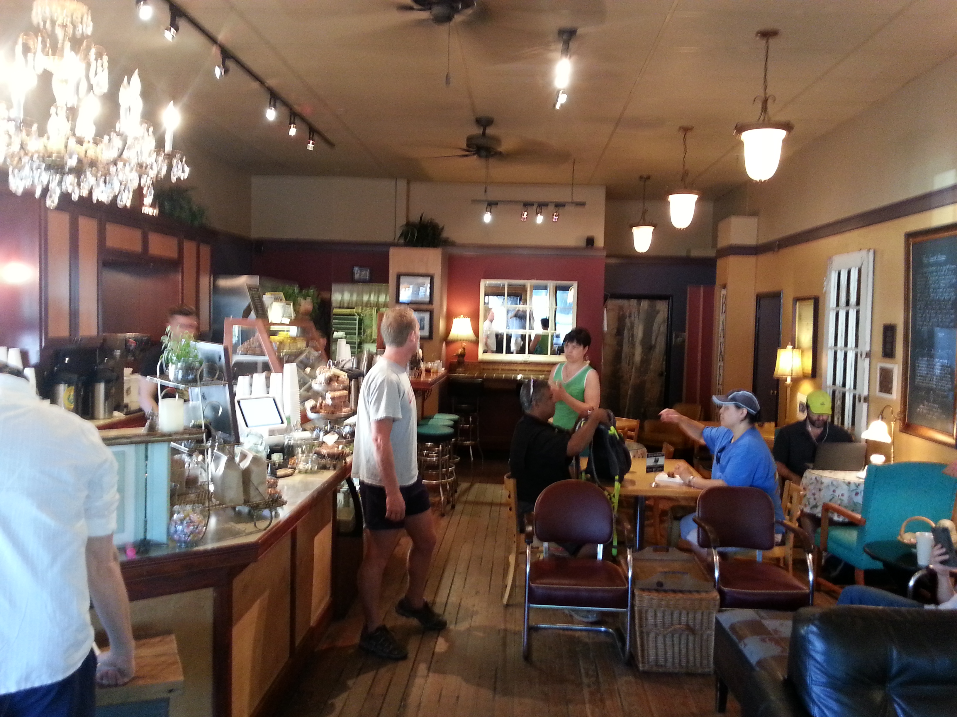 The shop possesses an array of interesting chandeliers, along with quirky windows and mirrors, that are visual delights. That coupled with a variety of seating options, homemade pastries, an obvious commitment to environmnetal sustainability, and a bike corral, make the shop a wonderful place for us to hang out in, even though it’s a relatively small space.