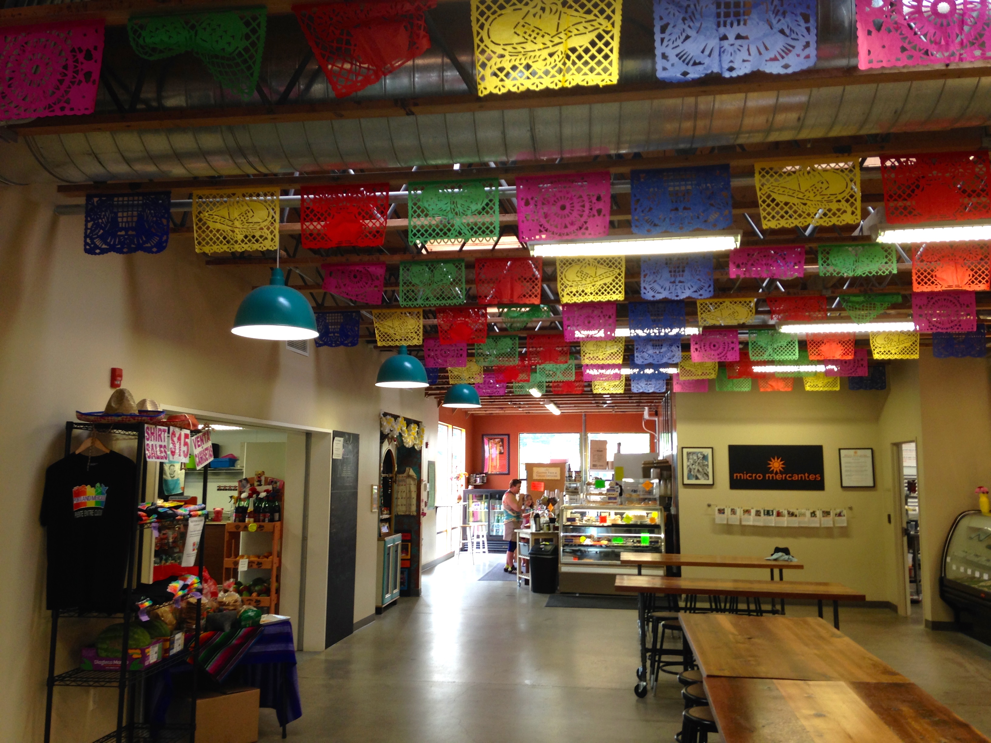 Revolucion has some very interesting artistic and colorful touches in its ordering area, but you don’t see them when you are sitting down as it uses the indoor and outdoor tables/chairs of the Mercado itself for its customers. The indoor seating felt too institutional-like, so we enjoyed the big wooden picnic chairs outside.