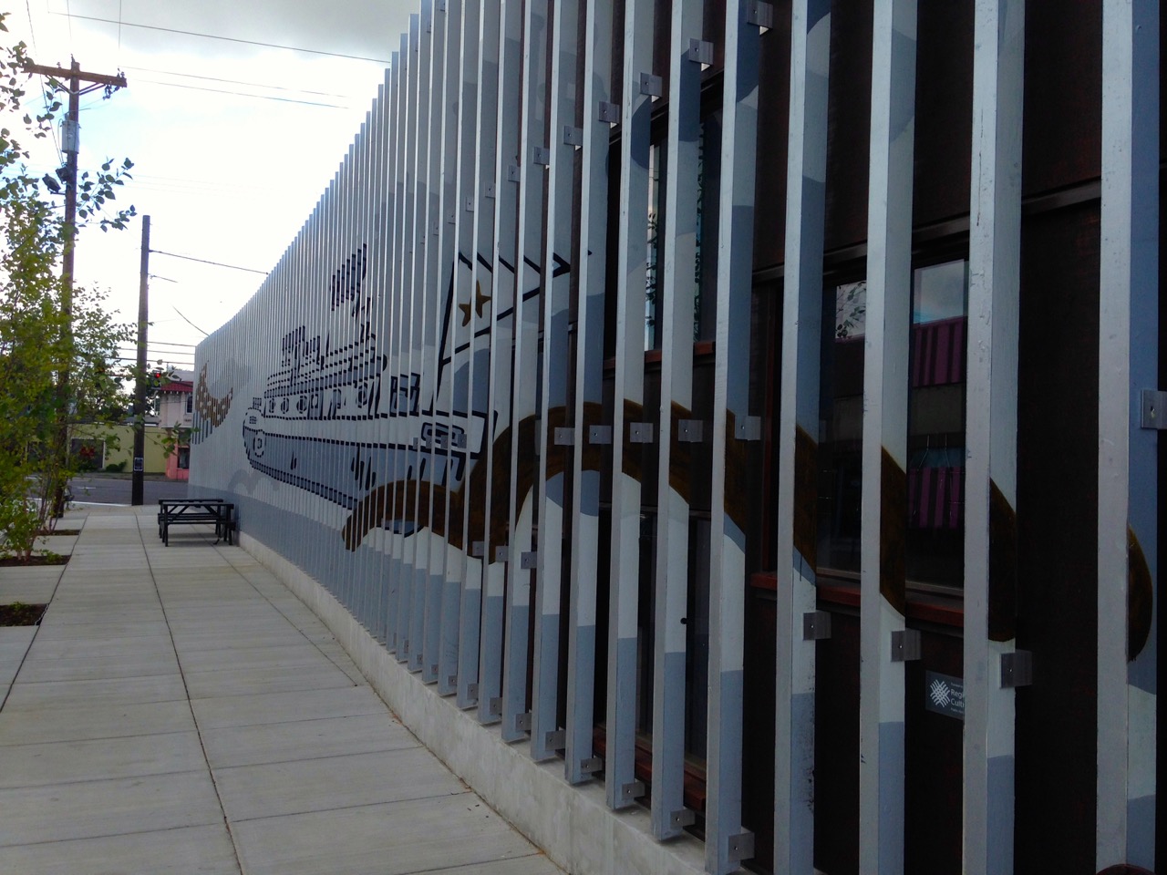 At the triangle block of NE Sandy and 28th, pioneering developer Kevin Kavanagh has just rehabbed an unsightly, neglected building into a mecca for foodies, with each of the Zipper Building’s establishments serving food. The exterior of the building is surrounded by tall wooden slats that change design depending on the direction one looks at the building.